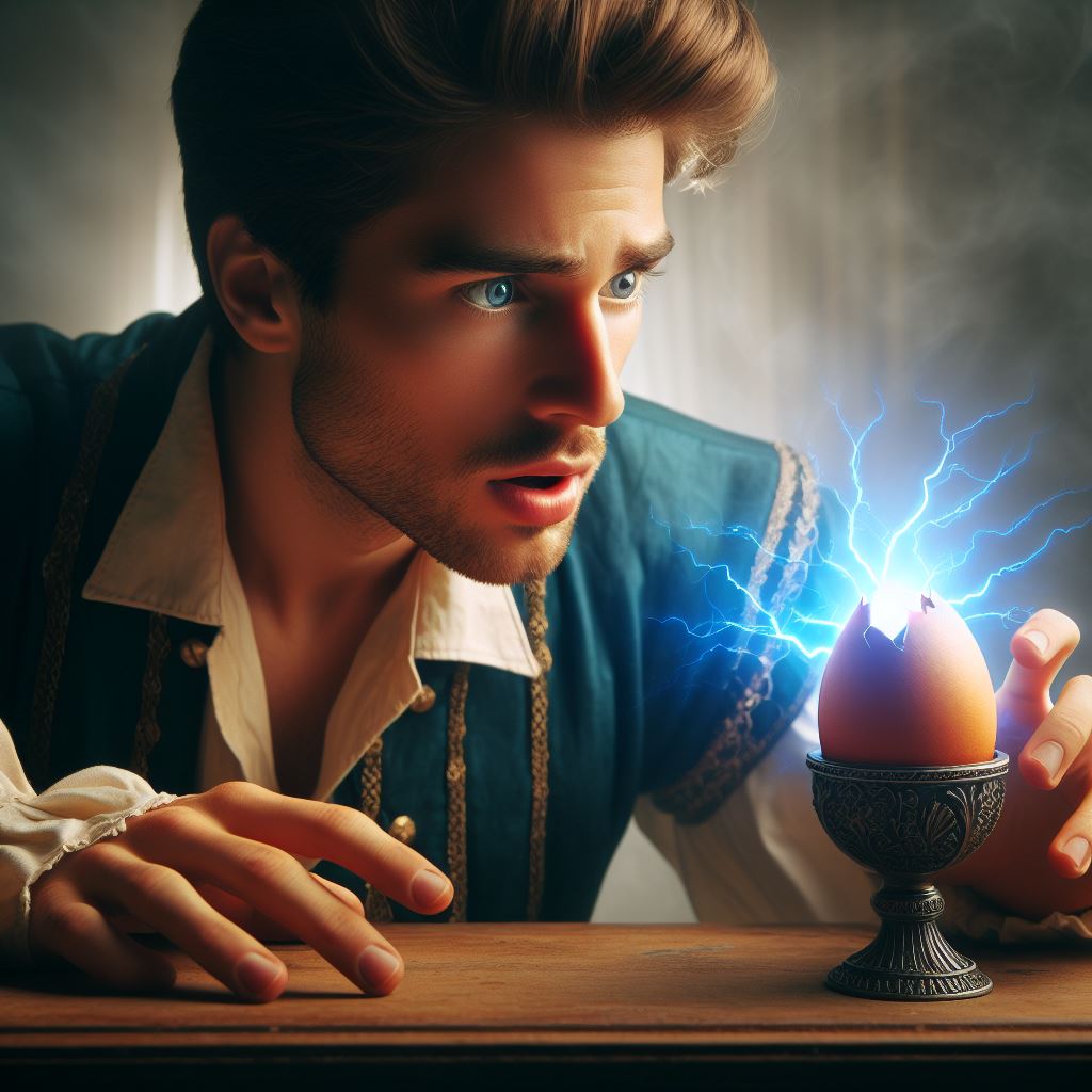The egg, now hurtling through the air at many miles an hour, whistled as its trajectory was directed out of the open window and toward the palace grounds below. Aniello raced to the window, half-throwing himself out of it but alas, his breakfast-child had vanished from his sight. His heart lurched from his chest as he contemplated his loss and anger burnt ferociously within him. Aniello turned, preparing himself to beat his pesky poultry-wife but then he heard a strange noise.
