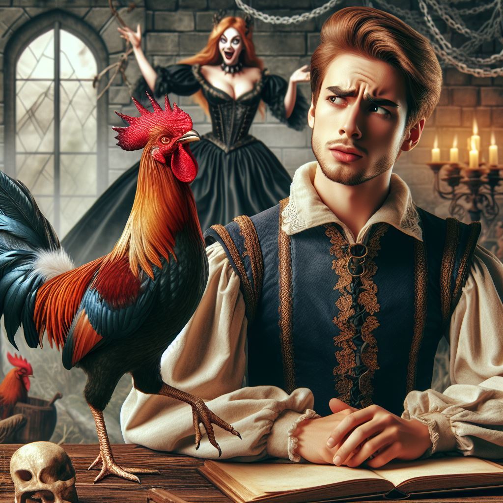 Rachel shook her head in exasperated disbelief before shouting “Aniello! Hoy Aniello, come take this creature away!” Aniello the cockerel looks up, not really understanding what’s going on. What, or rather who should he see coming out of the castle doors but… another Aniello! The cockerel looks at Rachel then the approaching Aniello, back to Rachel, back to Aniello! “What creature my love?” enquires the new Aniello. “This one!” she gesticulates harshly at the cockerel Aniello, who now is caught in a kind of stunned inertia.