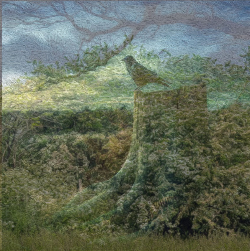 The lad walked on, the day grew short. The village was long behind him but the fen seemed so, so vast. As twilight blue settled about him and the air grew more chill, the lad wondered what he would do for the night. At length he walked by an old tree stump, so wide it stuck obtrusively out of the hedgerow. In the fading indigo he could see a crow perched on the top of the stump, just above the line of whitethorn.