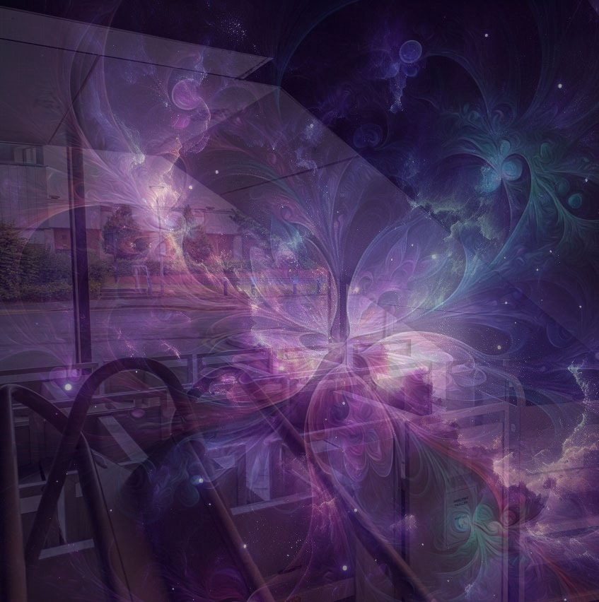 Almost in a trance he watched the purple patches floating in the dark. Then slowly but surely round the edge of of the patches formed a soft green glow. The patches bobbed, and joined in with one another, they separated out, and in this weaving movement of strange light occasionally the lad thought he could make a out a scene that flickeringly appeared between the patches, filling in the rest of the dark. Once there was a blue sky with clouds that floated through, then there was a woodland glade where a blackbird fluttered through, sunlight striking branches in the clearing, now there was a stream bright and clear, unduluating sparkling on its every moving surface, now a bridge under over the stream and a railing on the bridge. The railing was of smooth metal piping which became, as he fell harder into the image, longer and no longer the rail, but pipes that went a long a beige plastered wall.